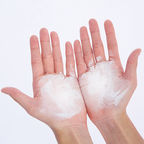 1適量を手に取り、ダマにならないように両手のひらに薄く伸ばす。最初はたっぷり取り過ぎず、少しずつ使うのがムラなく銀髪を作るコツ。